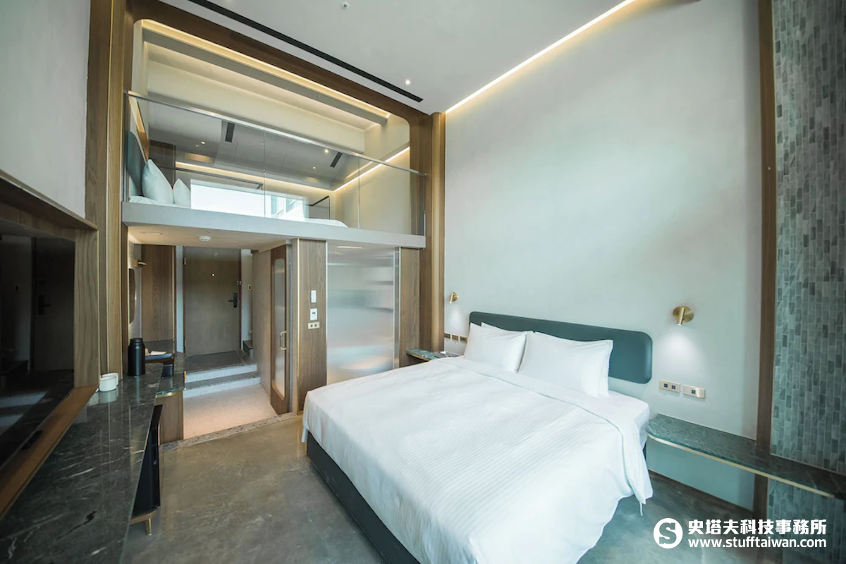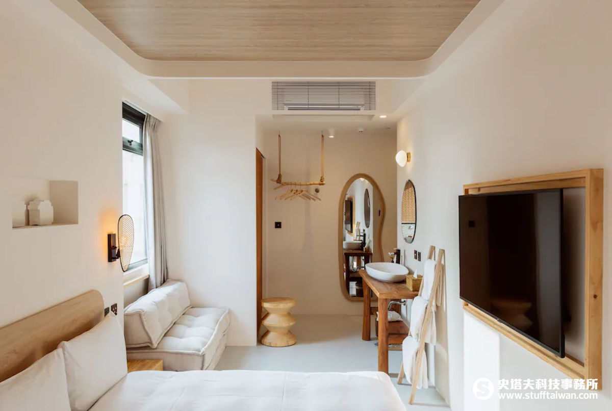 時尚簡約的米白木質調設計,旅館開車至駁二約9分鐘。