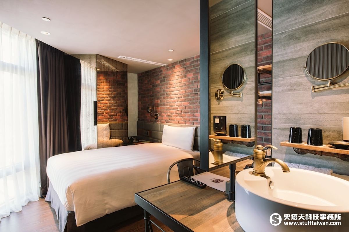 全館設計展現出復古工業風格,透過磚牆、鐵件與懷舊傢俱的結合,