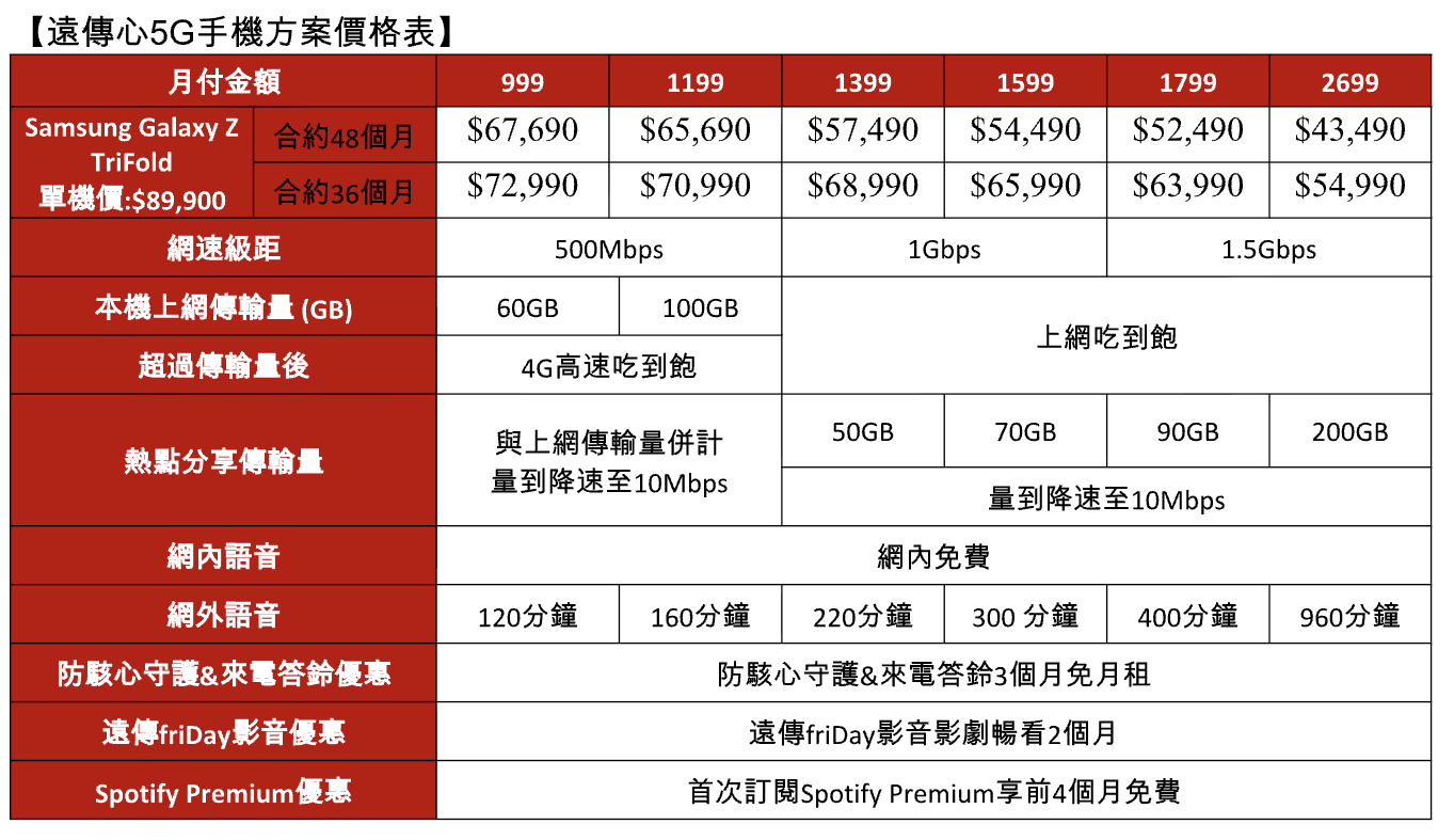 • 資費專案: 月付 1,399 元,Galaxy Z TriFold 專案價 57,490 元起。