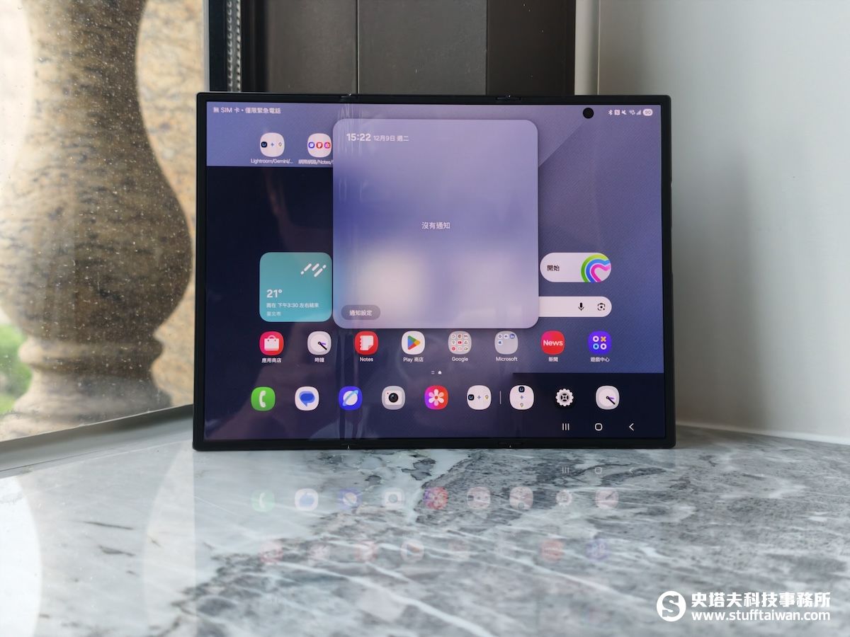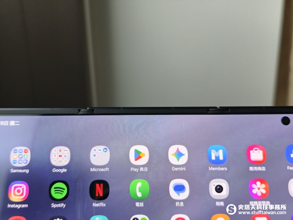 當Galaxy Z TriFold完全展開,10吋的大螢幕攤開在眼前時,螢幕巨大令人震撼。雖然可以清楚看到兩道摺痕,但因為螢幕比例更接近4:3長方形,視覺重心被平均分散,摺痕不會像Galaxy Z Fold雙摺機集中在視線正中央。