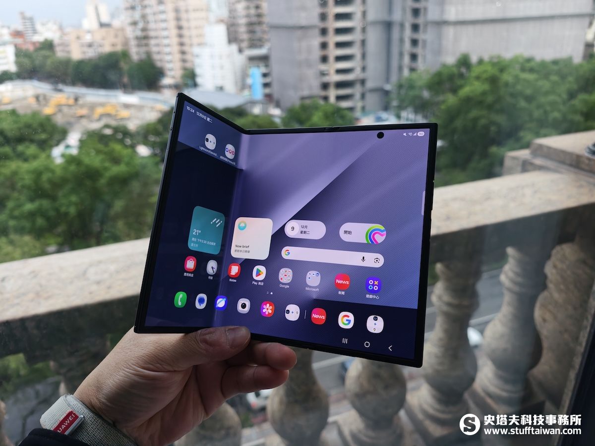 將Galaxy Z TriFold展開到第一段時,外觀的變化開始變得有趣。這個狀態介於手機與平板之間,比例更適合橫向使用。Galaxy Z TriFold的摺疊方式,是左邊三分之一先蓋上、接著右邊三分之一再蓋上。