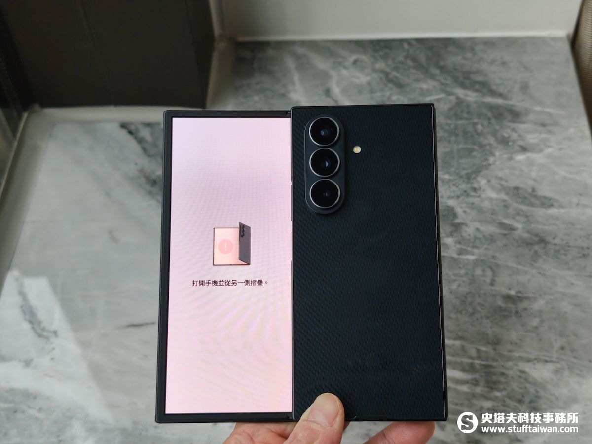 如果沒有按照順序,將Galaxy Z TriFold的右邊三分之一先蓋上,左邊三分之一的螢幕就會顯示「打開手幾並從另一側摺疊」,並且不斷發出震動的警示。因此使用Galaxy Z TriFold時,要提醒自己:先左後右!