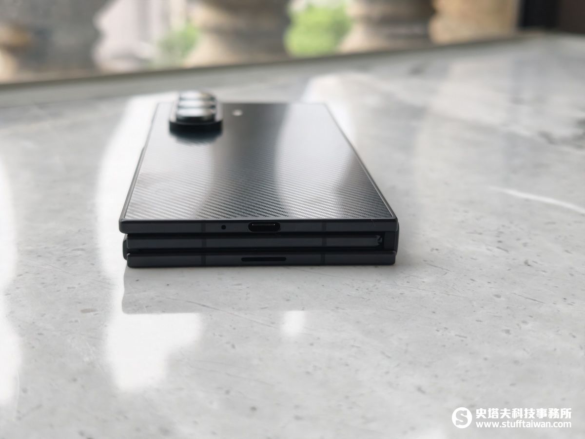 Galaxy Z TriFold從機身頂部與底部,都能看到其三摺疊的結構。