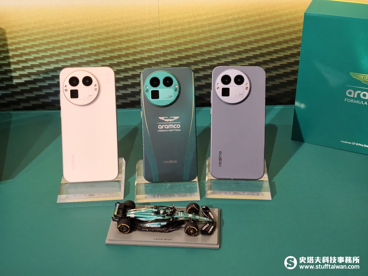 同步亮相的還有兩款真無線藍牙耳機:主打52dB深度降噪的 realme Buds Air7,以及配置大動圈、主攻強勁音質的realme Buds T200 Lite。realme GT 8 Pro提供「風動白」與「星馳藍」兩色,16GB/512GB建議售價為新台幣30,990元,而奧斯頓馬丁F1限量版16GB/512GB建議售價為新台幣32,990元。新機於即日起開放預購,12月26日正式上市。電信通路則將由台灣大哥大於2026年1月2日獨家開賣,搭配指定專案價最低僅需5,990元,首賣期間購機並登錄更有機會獲得價值超過1.7萬元的豪華贈禮與螢幕保固。