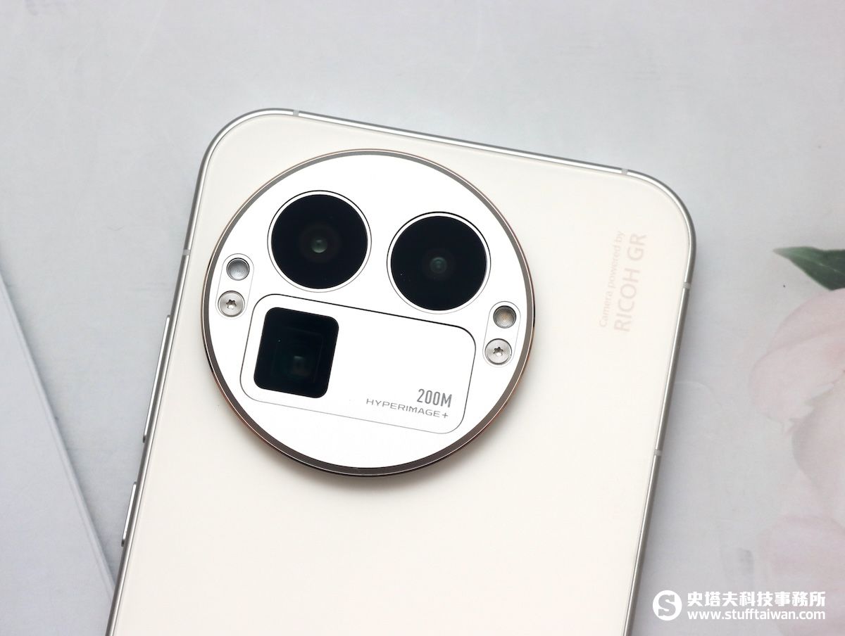 後鏡頭模組採用三鏡頭,主鏡頭搭載50MP的理光 GR防眩光鏡頭,感光元件尺寸為1/1.56吋,擁有F/1.8光圈,採用7P高透鏡片,並施加五層抗反射鍍膜。高透鏡片玻璃搭配雙層AR鍍膜,達到高達97%的透光率,反射率低至0.2%,可減少鬼影和眩光的產生。此外,深層吸收藍光玻璃濾鏡的加入,可阻擋30%不需要的紅外線光,提升成像的純淨度。