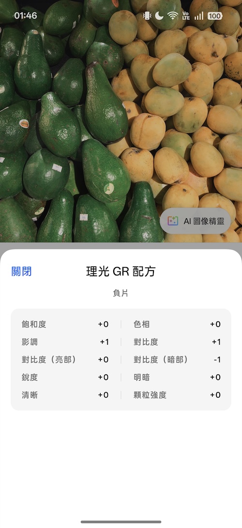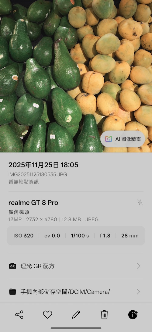 realme GT 8 Pro使用理光 GR模式拍攝的照片,在相片資訊內可看到「理光 GR配方」的詳細數值。
