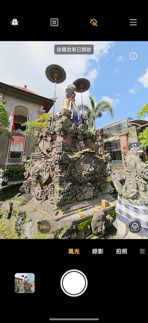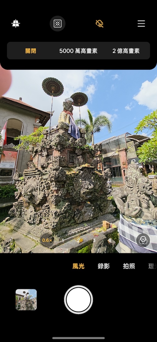 以下是不同焦段,使用realme GT 8 Pro的「AI 風光」模式對比一般拍照模式,在各個場景中的對比。在雨季的峇里島,使用AI 風光模式後,可即時修正陰天的霧霾,讓整體照片更有通透感。