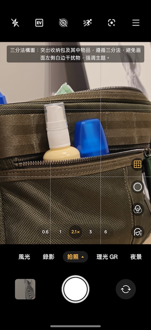 AI 技術的加入,讓攝影變得更加智慧。AI 構圖大師功能可以智慧取景,幫助使用者完成美學構圖。只需輕按一下相機介面右側的網格圖案,系統就會推薦最佳取景範圍,自動切換拍攝焦段,並提供所應用構圖原理的文字解釋。