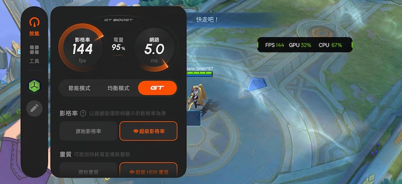 GT Boost 3.0當中,可快速切換GT模式、開啟超級影格率、超級HDR畫質、高解析度、極限觸控回應、高重新整理率。熱門槍戰遊戲則可連續1小時滿幀、平均幀率達143fps,以傳說對決為最高可達144fps。