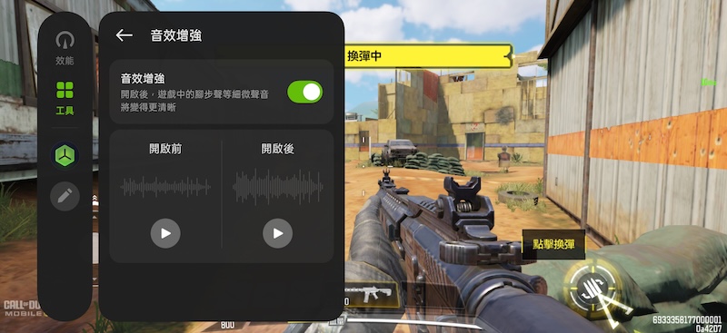 音效增強開啟後,遊戲中的腳步聲等細微的聲音,將變得更清晰,目前支援決戰時刻(CODM)