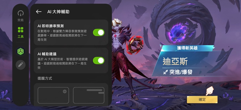 AI 大神輔助利用演算法提供智慧化建議,偵測玩家可能忽略的潛在危險,如敵方腳步聲、附近槍聲,或即將遭受到的攻擊,可透過視窗、語音等提醒,幫助玩家有效處理危機。還包括 AI 即時勝率預測,在對局中,根據雙方隊伍的陣容表現及數據來計算勝率,目前支援Mobile Legends: Bang Bang(MLBB)