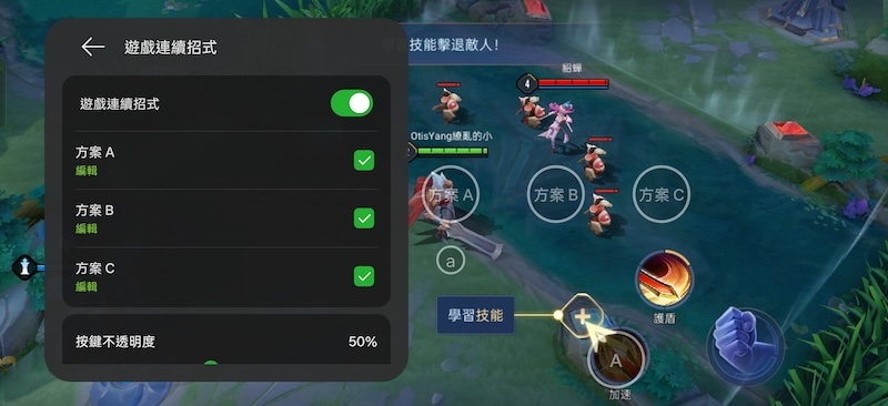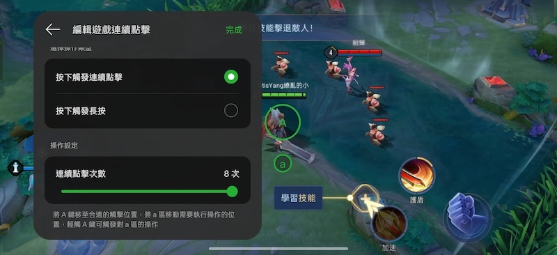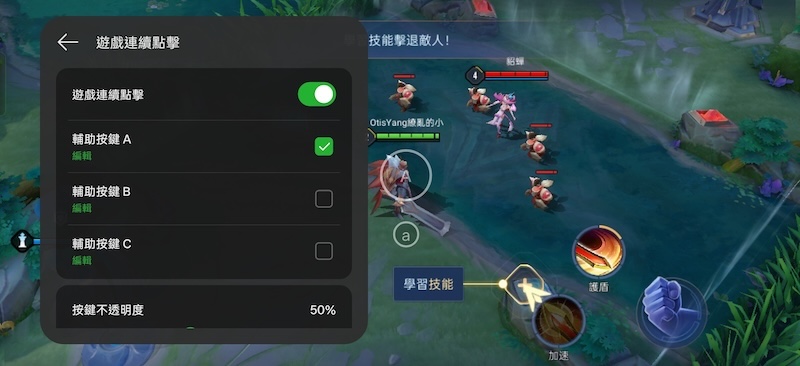 AI 超神一鍵連續招式在遊戲中新增輔助按鍵,增強遊戲體驗。包含遊戲連續點擊,可調整速度、連續點按最多每次八下,類似「連點程式」或「搶票神器」 ,以及遊戲中連續出招式來快速殺敵。