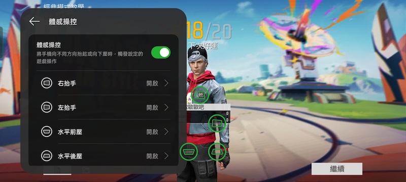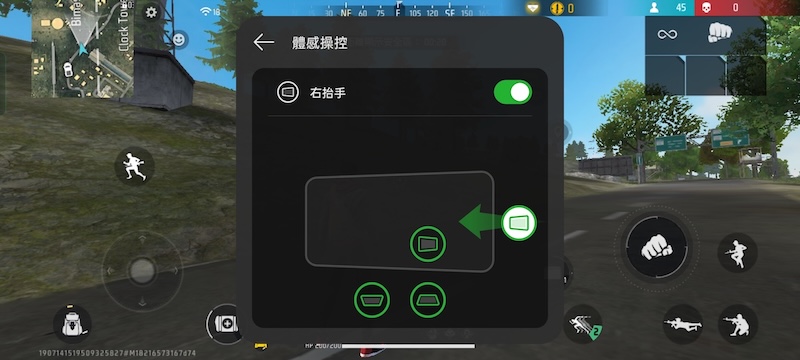 AI 體感操控可透過陀螺儀,將不同體感姿勢投射到遊戲中的操作裡,類似於Switch般的體感操作。支援左右體感操作和前後體感操作,開啟後將手機向不同方向抬起或向下壓時,觸發設定的遊戲操作