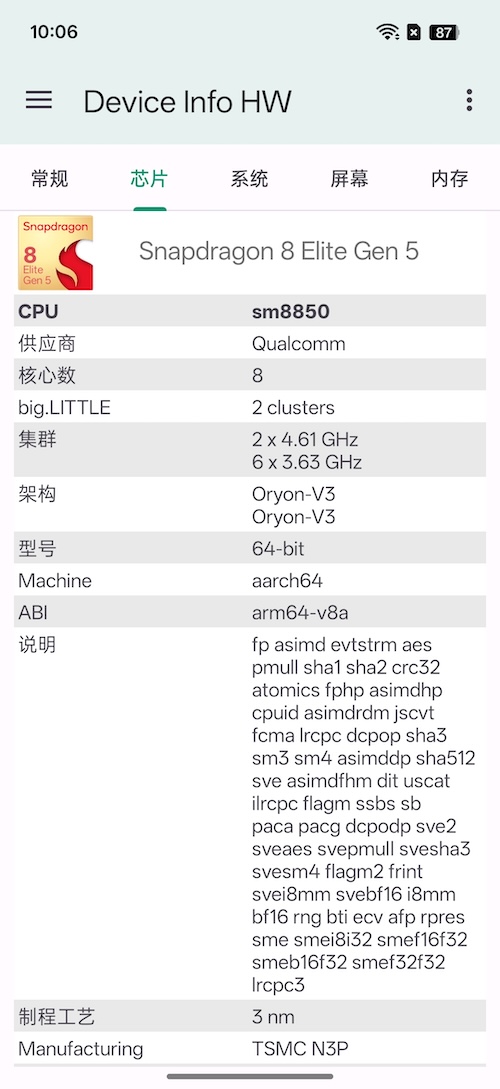 透過Device Info HW來查詢realme GT 8 Pro硬體資訊,高通Snapdragon 8 Elite Gen 5的內部型號為SM8850,CPU由雙核心4.61GHz與六核心3.63GHz組成。