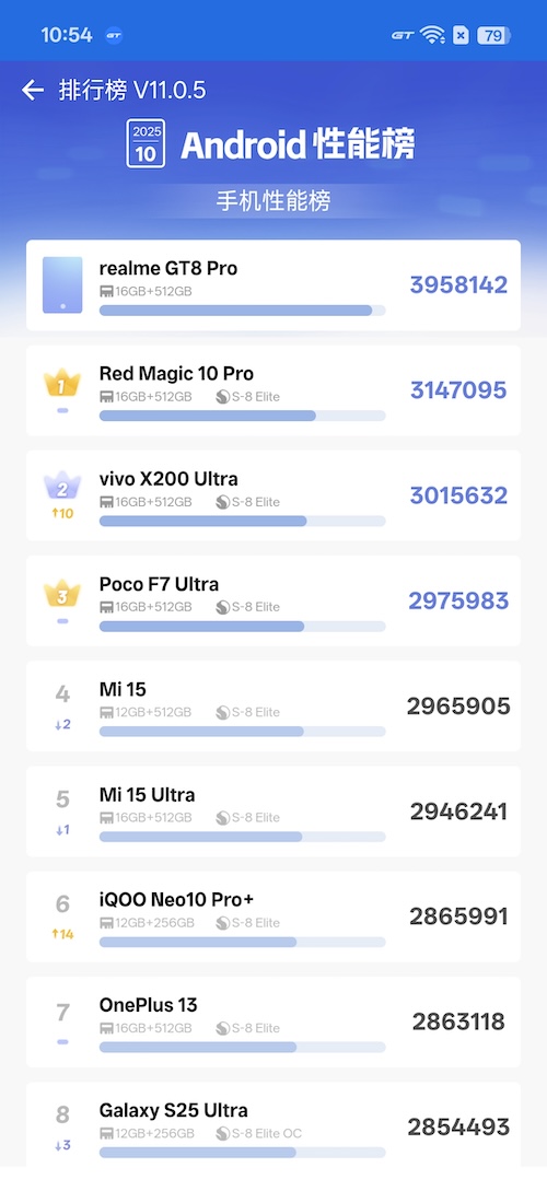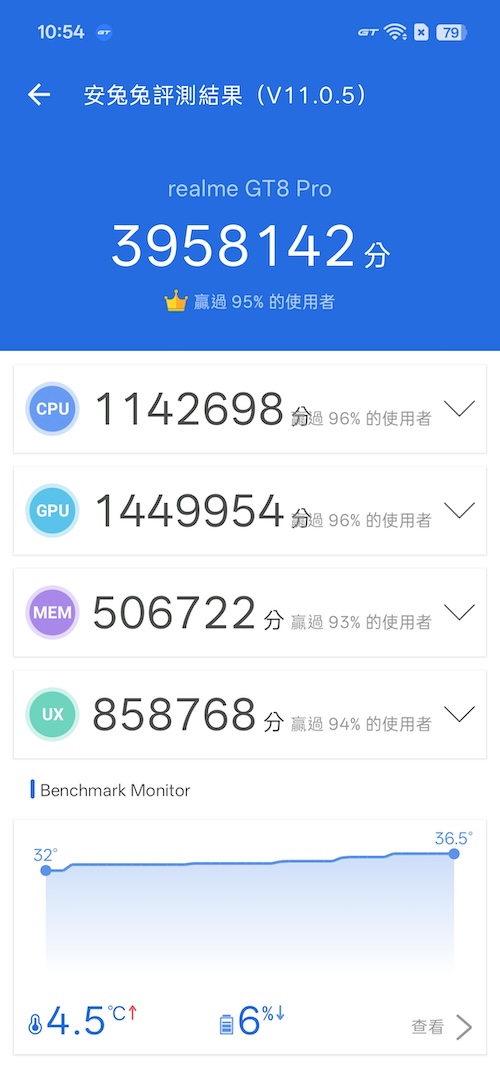 realme GT 8 Pro實測安兔兔V11.0.5得到約395萬分,接近官方宣稱的400萬分。