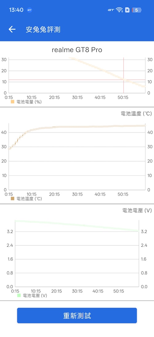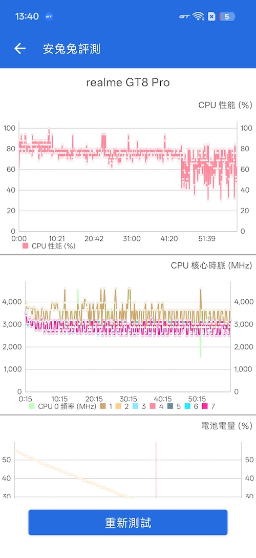 realme GT 8 Pro實測安兔兔性能的壓力測試1小時,在41分鐘後才有明顯的降頻,期間溫度從28度上升至44度、電量從54降為5%。