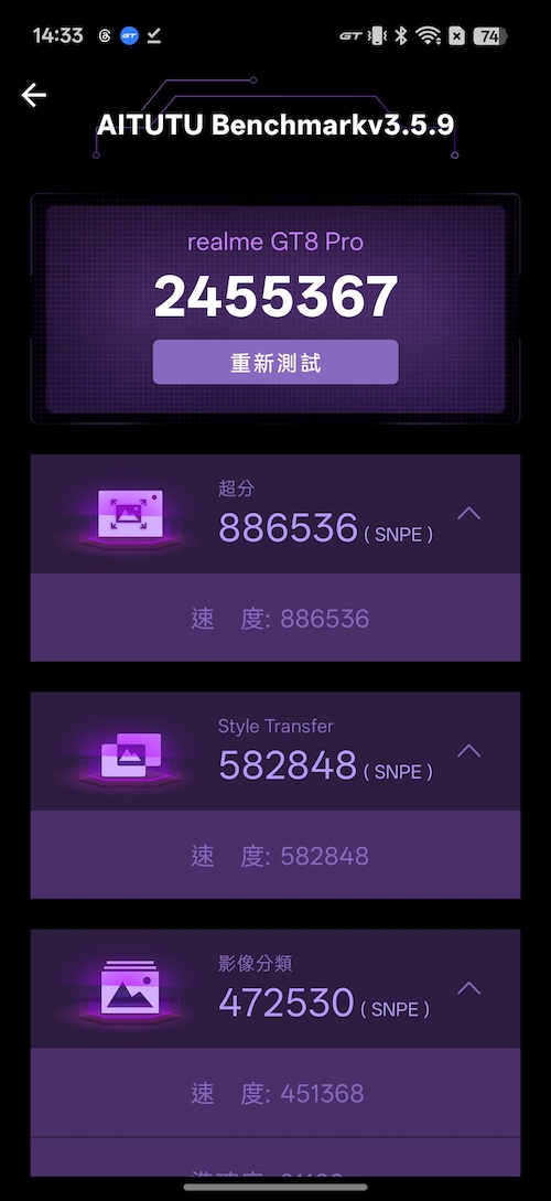 realme GT 8 Pro跑AITUTU的AI性能測試,高達245萬分。