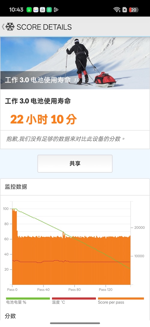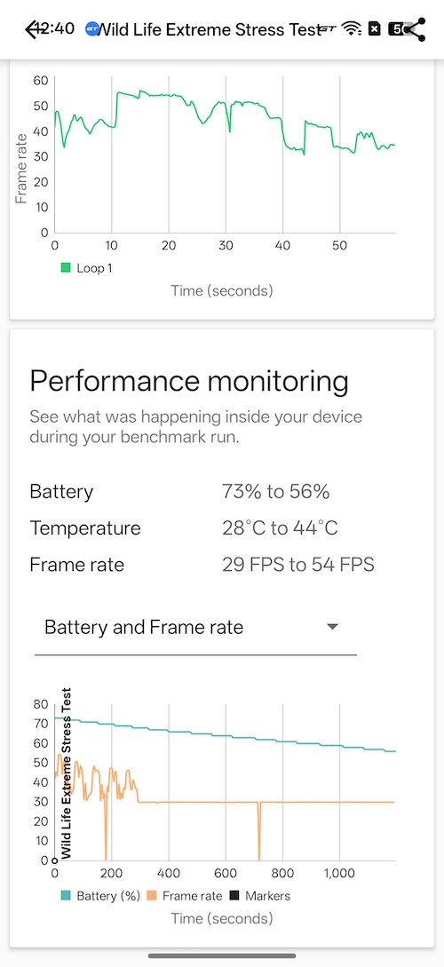 realme GT 8 Pro跑3Dmark-Wild Life Extreme壓力測試20分鐘,穩定度為66.8%、電池溫度從73%降為56%、溫度從28度上升到44度。