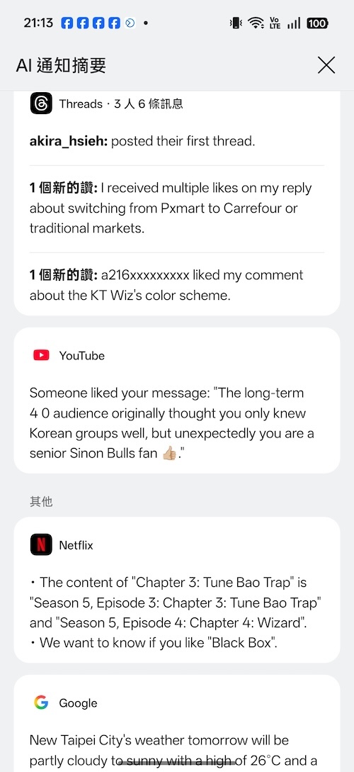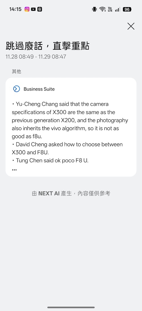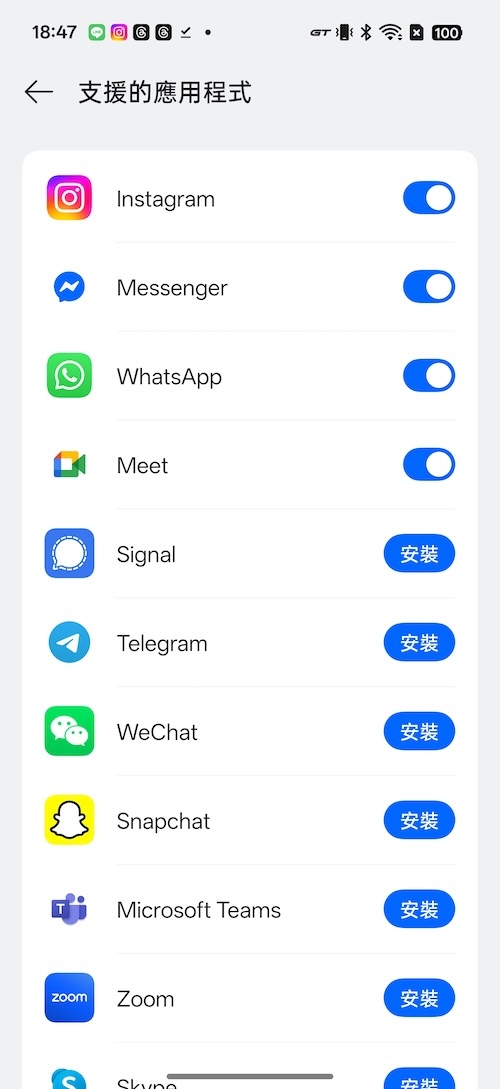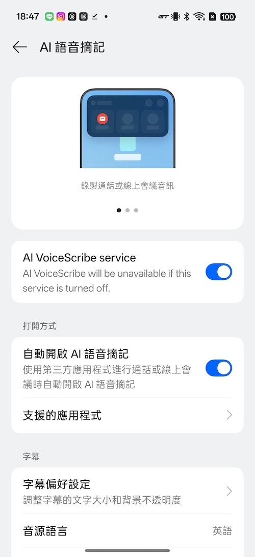 AI 語音摘記可輕鬆錄製通話及音訊,並生成摘要,還可以即時顯示雙語字幕 ,輕鬆理解內容。AI 語音摘記內可開啟支援的應用程式,包括IG、Messenger、WhatsApp、Telegram、Wechat、Meet等民眾常用的功能。