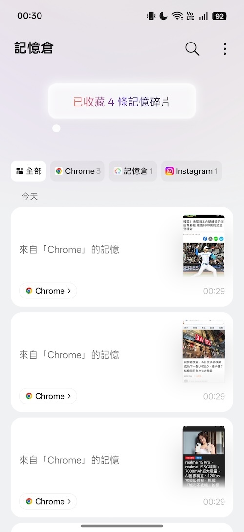 記憶倉可系統化的管理知識、文章、筆記、攻略、行事曆活動及代辦事項等,打造用戶的專屬記憶空間。使用方式是三指上滑觸發「一鍵閃記」,在任何螢幕上的畫面內三指上滑,即可即時紀錄當下的畫面內容,並在記憶倉內搜尋相關記憶。