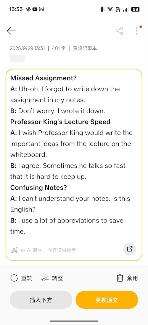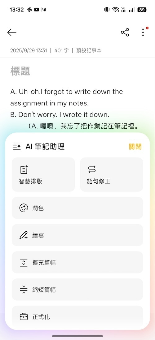 AI 筆記助理能智慧排版、語句修正、潤色、寫作、填充篇幅、精簡篇幅、正式化等多種功能 ,幫助使用者精準潤飾、快速延伸,還能一鍵擴充篇幅,提升生產力,快速完成報告或是社群內容