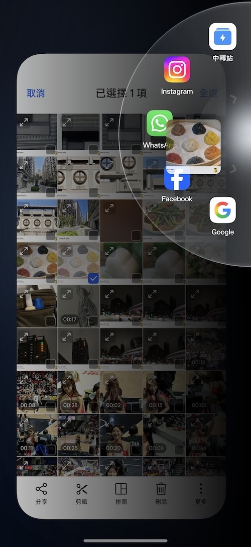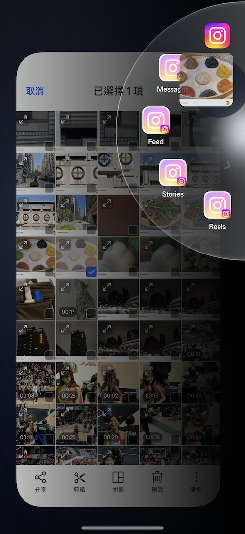 空間輪盤(AI 傳送門)可識別螢幕內容,預測用戶需求 ,免去用戶來回切換。例如圖片拖曳到左邊後,停留在IG的圖示上時,還可進一步選擇要快速上傳到貼文、限時動態、reels、私訊等內容,文字也能拖曳滑動到空間輪盤內傳送。