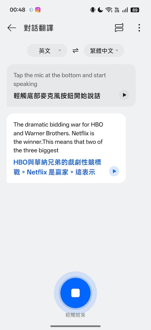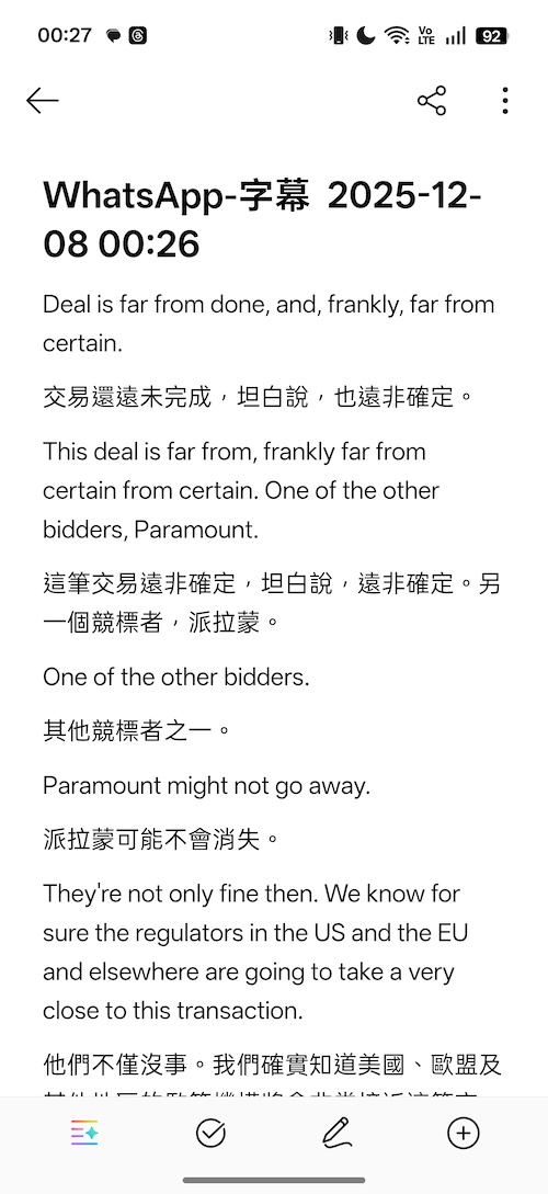 例如在Whatsapp通話中,可即時將外語的通話內容即時翻譯,最後自動整理AI摘要。