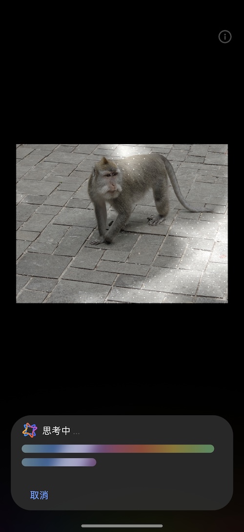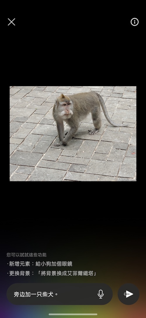 AI 圖像精靈可做到一句話修圖,所說即所得,將想像力交給AI 圖像精靈,輕鬆化為現實。例如:只要用語音輸入「在旁邊加一隻柴犬」,手機會自動生成一張猴子旁邊有柴犬的照片。