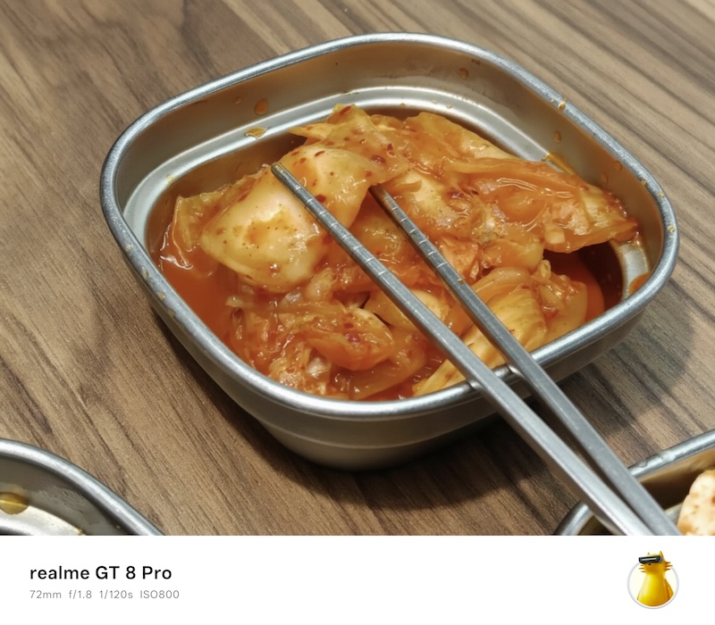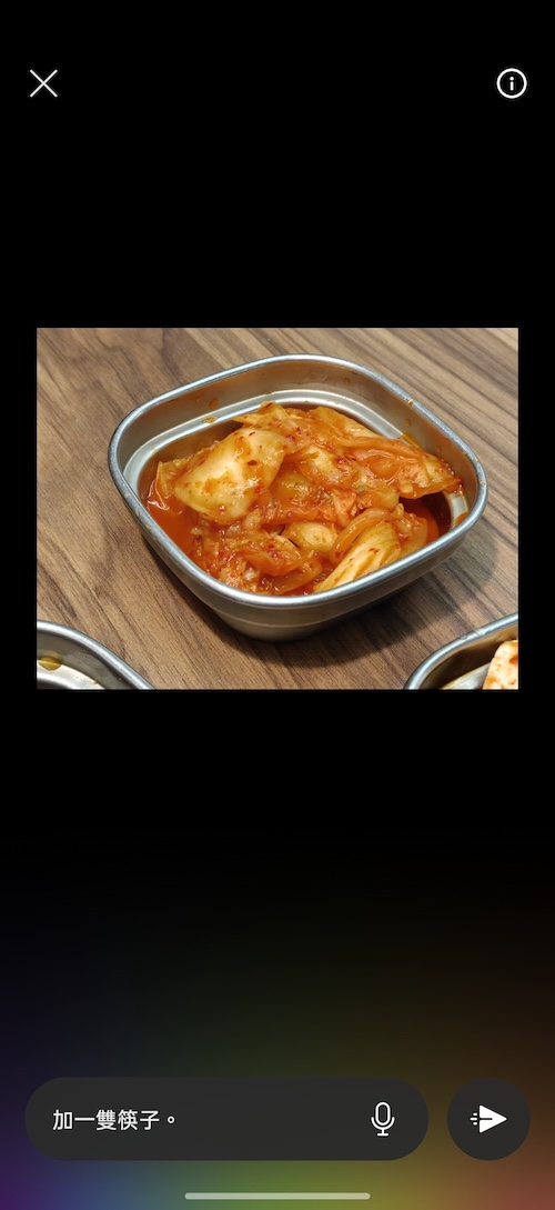 在一盤平凡無奇的泡菜內,語音輸入「加一雙筷子」,會自動生成一張韓式扁筷的照片,還不是生成圓筷非常聰明!