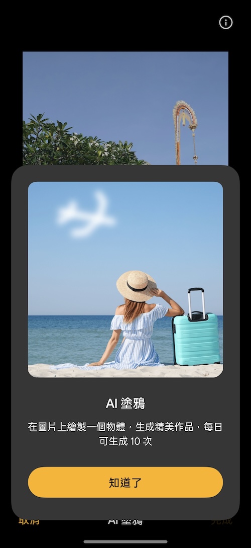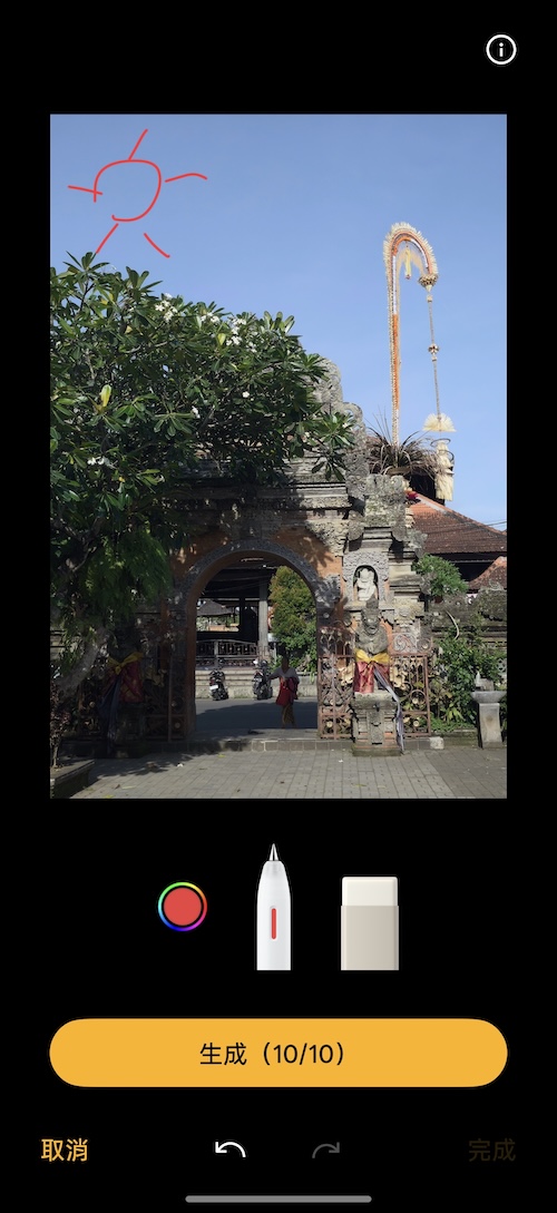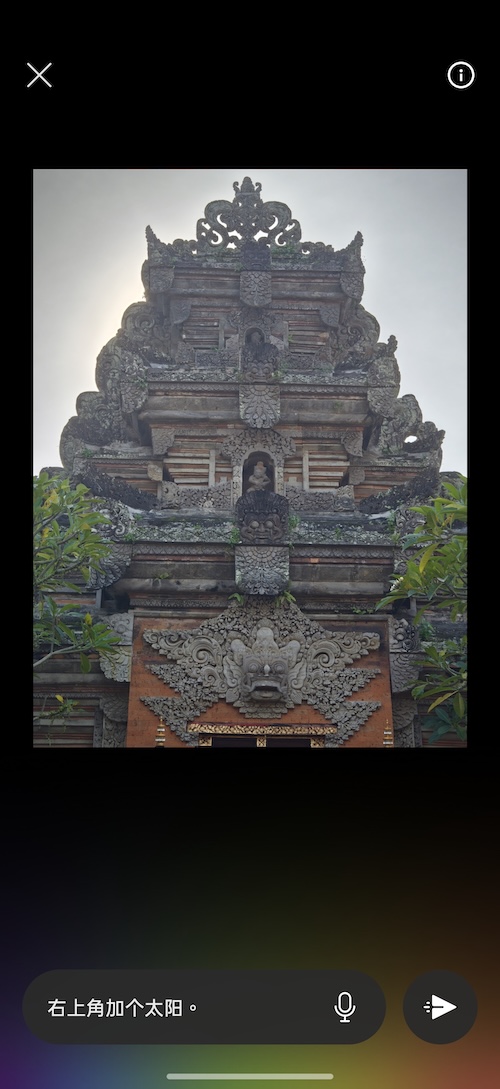 在峇里島經典的建築上,使用語音輸入「右上角加個太陽」,AI 圖像精靈會自動產生太陽,且太陽與建築的光影對比非常自然,不太像是用AI生成的圖片。