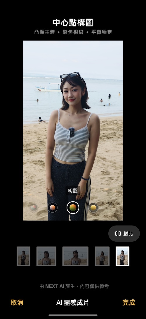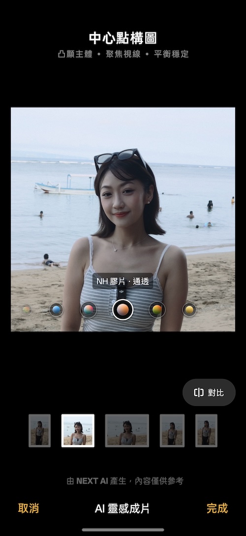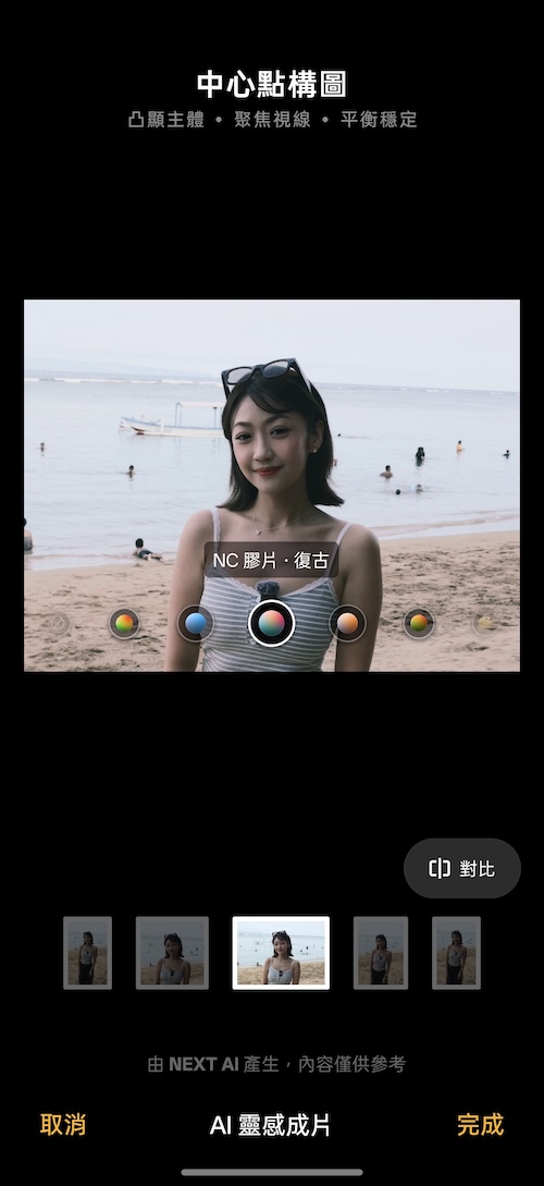 AI 靈感成片可自動選擇最佳濾鏡,並自動調整最佳構圖,凸顯主體、聚焦視線 ,圖片比例與濾鏡都能自由選擇,並即時預覽
