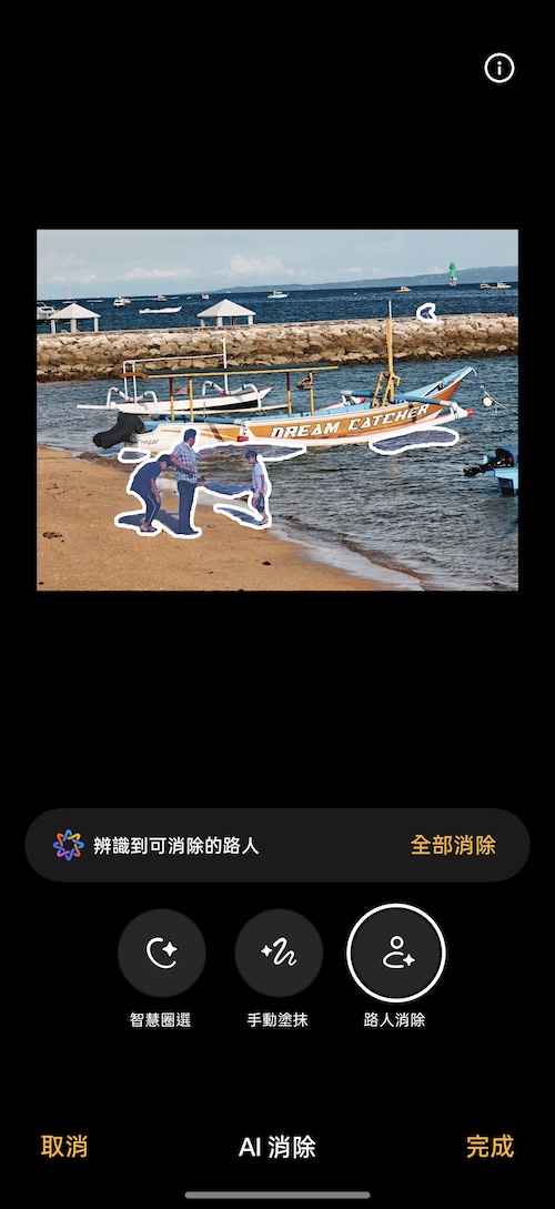 AI 消除可智慧識別物件,去除圈選的目標,並透過AI演算法修補圖像,填補人物消除後的空缺並重新生成