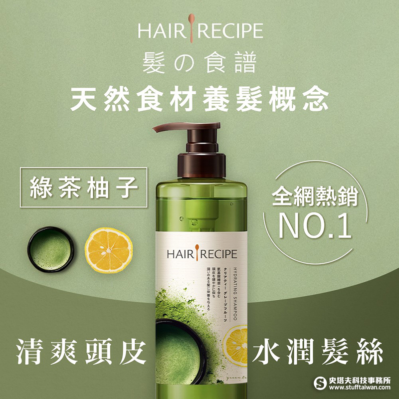 在網路上爆紅的「Hair Recipe髮の食譜」果然衝進了前三名!這款「綠茶柚子淨油保濕水感洗髮露」主打的是「用天然食材餵飽頭髮」的療癒理念。
