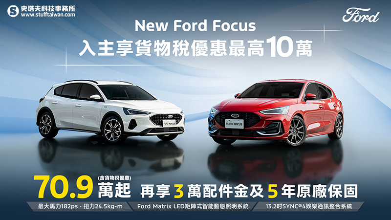 New Ford Focus結合動感外型與德規品質,提供多種車型,從旅行車到跨界休旅一應俱全,入主享貨物稅優惠價70.9萬起,再享3萬元配件金及5年原廠保固;
