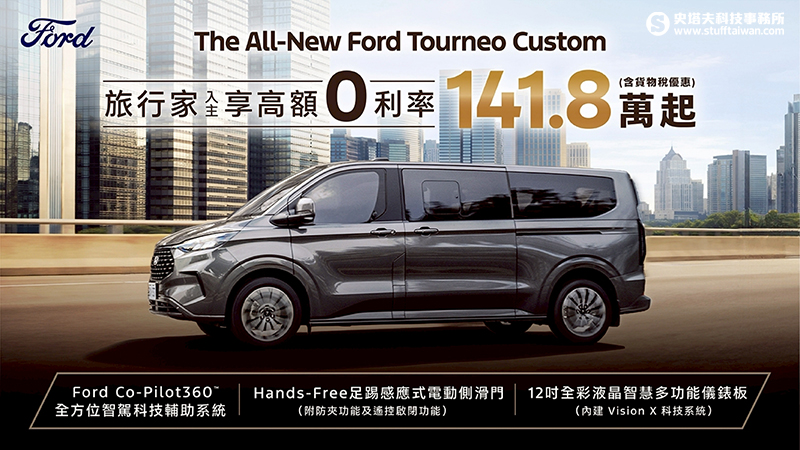 歐洲首選國際商旅The All-New Ford Tourneo Custom福特旅行家,享貨物稅優惠價141.8萬元起,入主再享高額0利率。