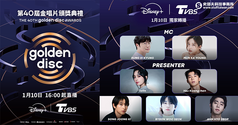 Disney+ 、TVBS帶來重磅驚喜!正式宣布將於 2026 年 1 月 10 日(六)16:00 起,全台獨家由TVBS歡樂台轉播及Disney+線上直播第 40 屆金唱片頒獎典禮(The 40th Golden Disc Awards),邀請粉絲一起參與韓國音樂年度最高榮耀的盛典。