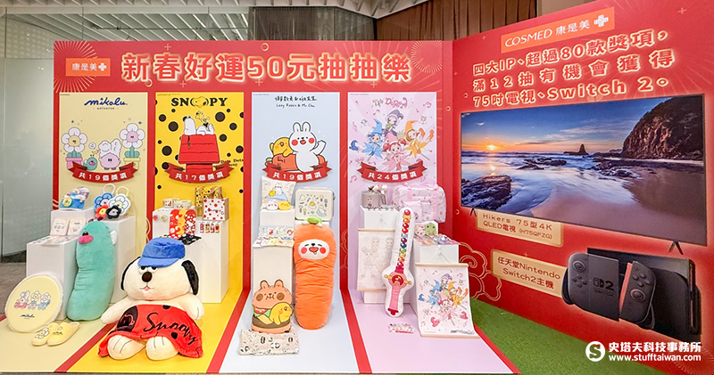 新的一年,就讓康是美「新春好運$50抽抽樂」開啟鴻運當頭的序幕!從經典暖心的 Snoopy、可愛療癒的mikolu、慵懶自在的懶散兔,到喚醒魔法少女心的小魔女DoReMi,四大IP大出擊,不僅獎項豐富、中獎率100%,更有機會博得 Switch 2 與75吋電視等夢幻大獎。