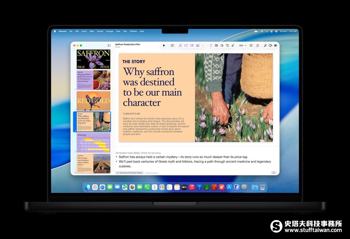 AI 輔助簡報: 支援從大綱自動生成 Keynote 初稿、自動建立發表人附註,並在 Numbers 中透過模式辨識自動填充公式。