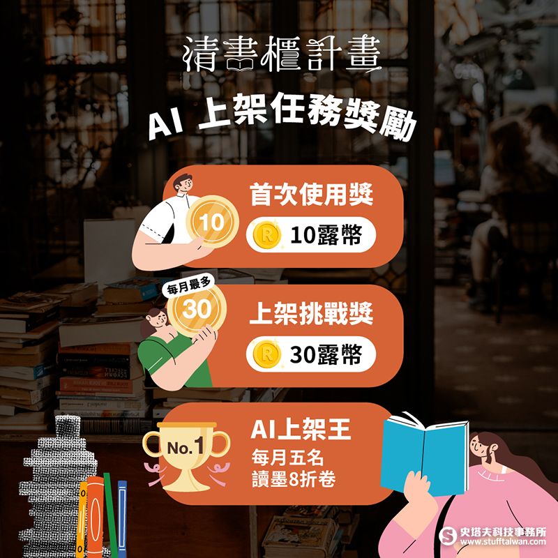 (2)「上架挑戰獎」每使用 書籍AI上架精靈上架 1 本書,即可獲得 1 露幣,每月上限 30 露幣;