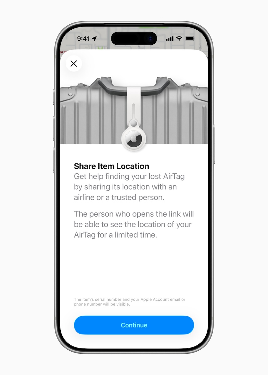新版 AirTag 完美結合 iOS 「分享物品位置」 功能。Apple 已與全球超過 50 家航空公司及 IT 供應商 SITA 合作,讓使用者能安全地將 AirTag 位置分享給地勤人員。