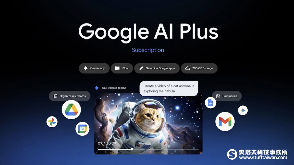 Google AI Plus 不僅包含上述 AI 功能,亦整合了 200GB 雲端儲存空間(供 Google 相簿、雲端硬碟與 Gmail 共享),並支援最多 5 位家庭成員 共同享有會員權益。