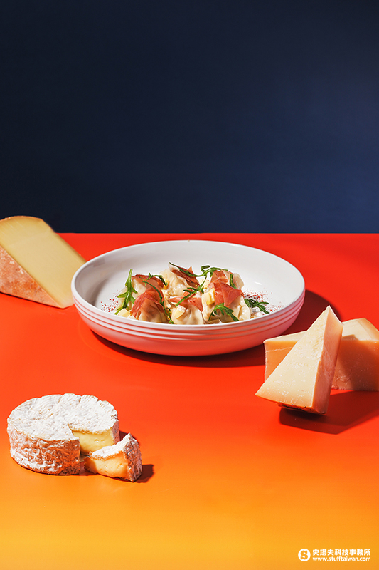 與市面上水餃同樣使用豬肉為主的「Jura」豬肉 / 康堤起司 / 卡門貝爾起司 / 火腿 / 巴黎白火腿奶油,在味覺上的表現卻別致獨特,餡料選用具流心質地的卡門貝爾起司及手切台灣溫體豬五花,與由多種起司及白火腿奶油製成的綿密醬料相得益彰;頂層妝點赭紅火腿、翠綠芝麻葉與鮮黃康堤起司,視覺繽紛誘人。