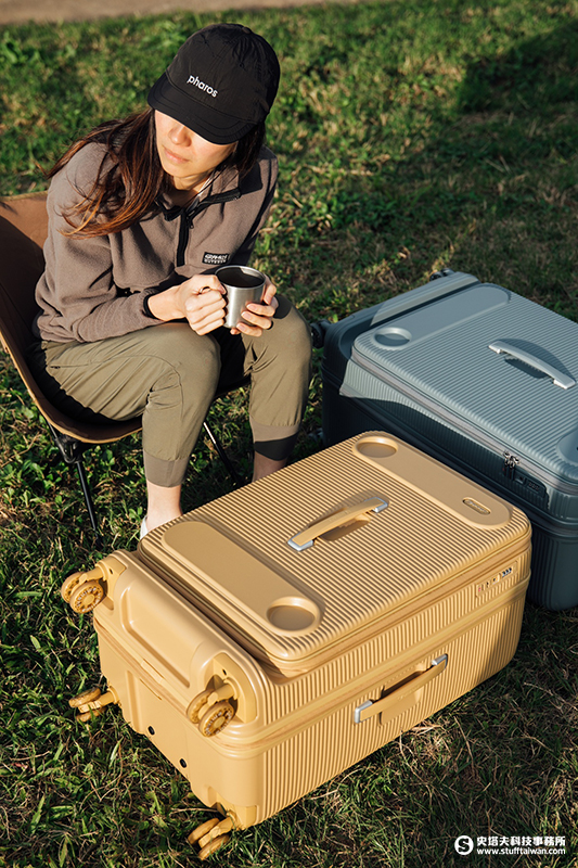 此外,FUNLOADER 搭載了極其流暢的溜冰輪設計,無論是充滿挑戰的戶外礫石地,或是綿延的城市柏油路,皆能維持一貫的平穩滑行,大幅減輕長途拖拉的負擔,其他細節如箱體配置的飲料置物架、頂部置物盤,還有獨特的「泡腳掛勾設計」,讓人在出行時,也能隨心懸掛物品、解放雙手,旅程更輕鬆。
