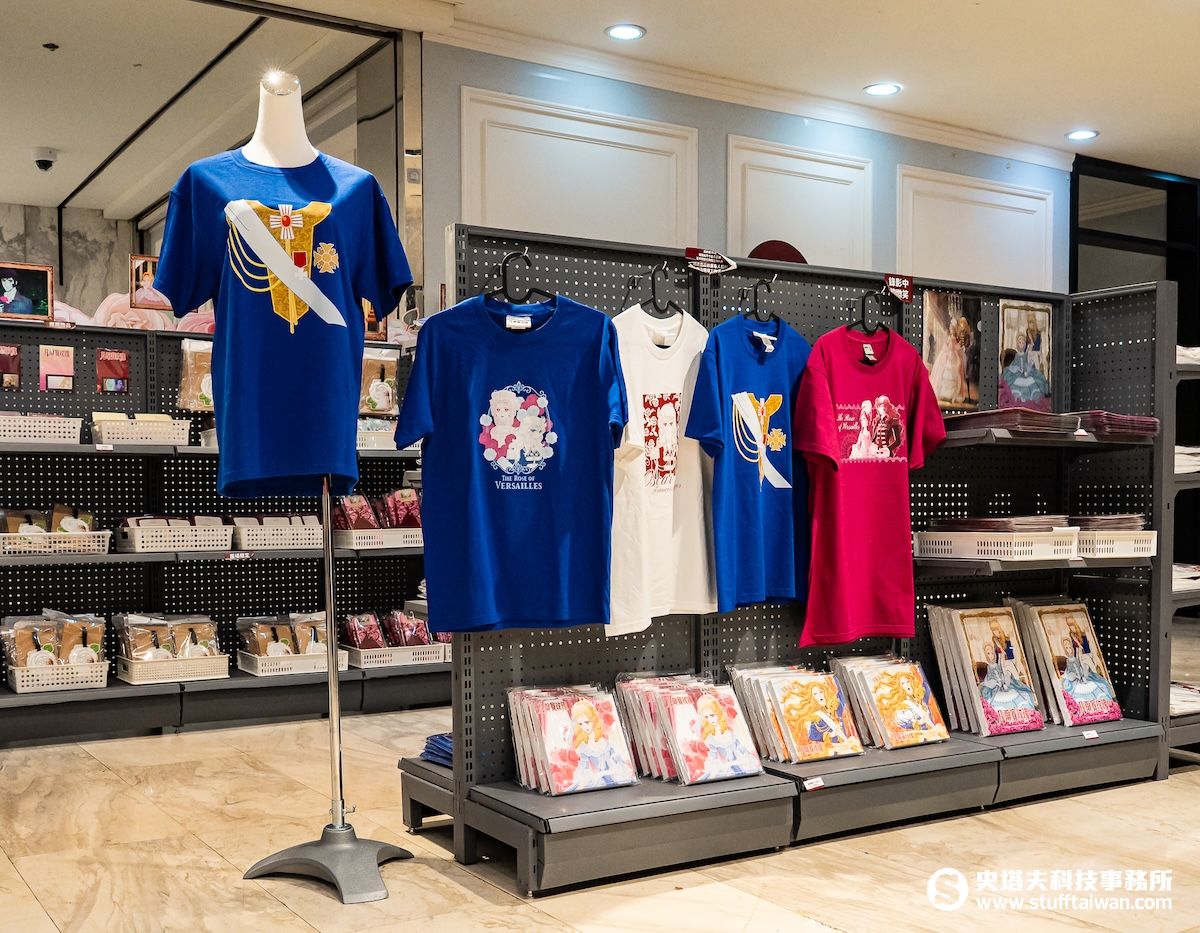 往店內走去,是展現整部作品戲劇張力,在時代洪流中彼此牽絆的四位角色「主視覺牆」。旁邊一整排精選多幅原作畫面的「經典原畫廊」,從宮廷舞會、軍服英姿到革命動盪前夕的眼神刻畫,還原了細膩又充滿力量的美學,彷彿再次將粉絲們拉回劇情中,感受角色命運的重量。
