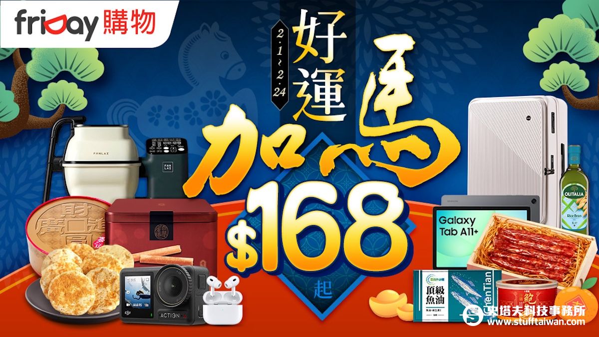 喜迎農曆金馬年,friDay 購物 即日起至 2 月 24 日強勢推出 「好運加馬」 迎春盛典!本次活動不僅祭出 168 元起的新春話題好物,更針對走春穿搭、年節禮盒及 3C 換機潮提供超有感折扣,讓消費者在春節期間省錢又有面子。