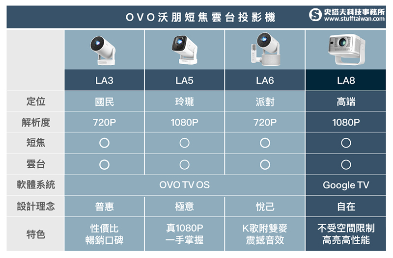 OVO 旗下沃朋(Warpple),在短短 8 個月內發表了 4 款定位不同的短焦雲台投影機新品,同時宣布今年 1 月雲台款銷量佔比首度突破 50%!最新推出的首款高階雲台投影機 LA8 ,整合短焦技術、200° 雲台與 Google TV 系統。相較前代畫面變大 53%、亮度增強 71%、體積減少 29%,是追求高端性能用戶的首選。