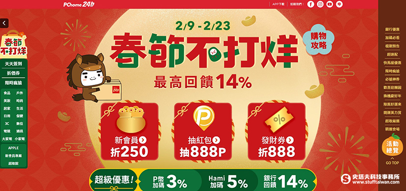 PChome 24h祭出「春節不打烊」初一至初六期間「紅包抽抽樂」活動,每檔加碼5,000個中獎檔次,讓消費者在年節期間不僅能購足高效能裝備,更能嘗試好手氣將大獎抽回家!