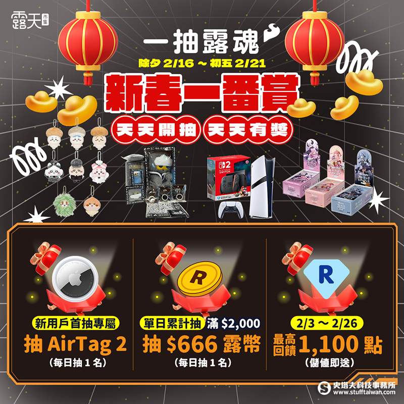 另一亮點為「一抽露魂」線上一番賞的服務,在農曆春節除夕至初五(2/16~ 2/21)推出「天天開抽、天天有賞」三重活動:新用戶首抽專屬抽 AirTag 2(每日抽 1 名);單日累計抽滿2,000元,即抽 666 露幣(每日抽 1 名) 。