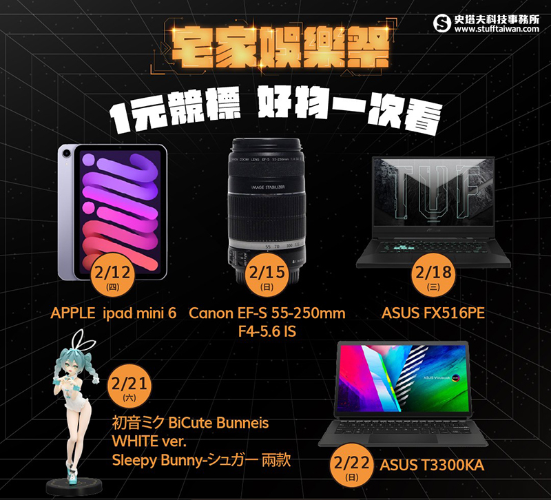 精選熱門動漫IP公仔、遊戲主機周邊、電競筆電與話題收藏商品,以「1元起標」形式開放競價,打造即時互動的新春娛樂。首波強打於 2/12(四) 由 APPLE iPad mini 6 打頭陣,輕巧強大的效能是追劇與遊戲的首選;