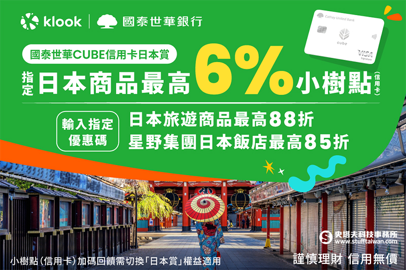 針對此次活動,凡於Klook購買日本指定商品,刷國泰世華CUBE信用卡並切換日本賞權益,即可享6%小樹點(信用卡)回饋無上限。輸入限量優惠碼,日本指定商品再享88折,優惠疊加後折扣低至83折。
